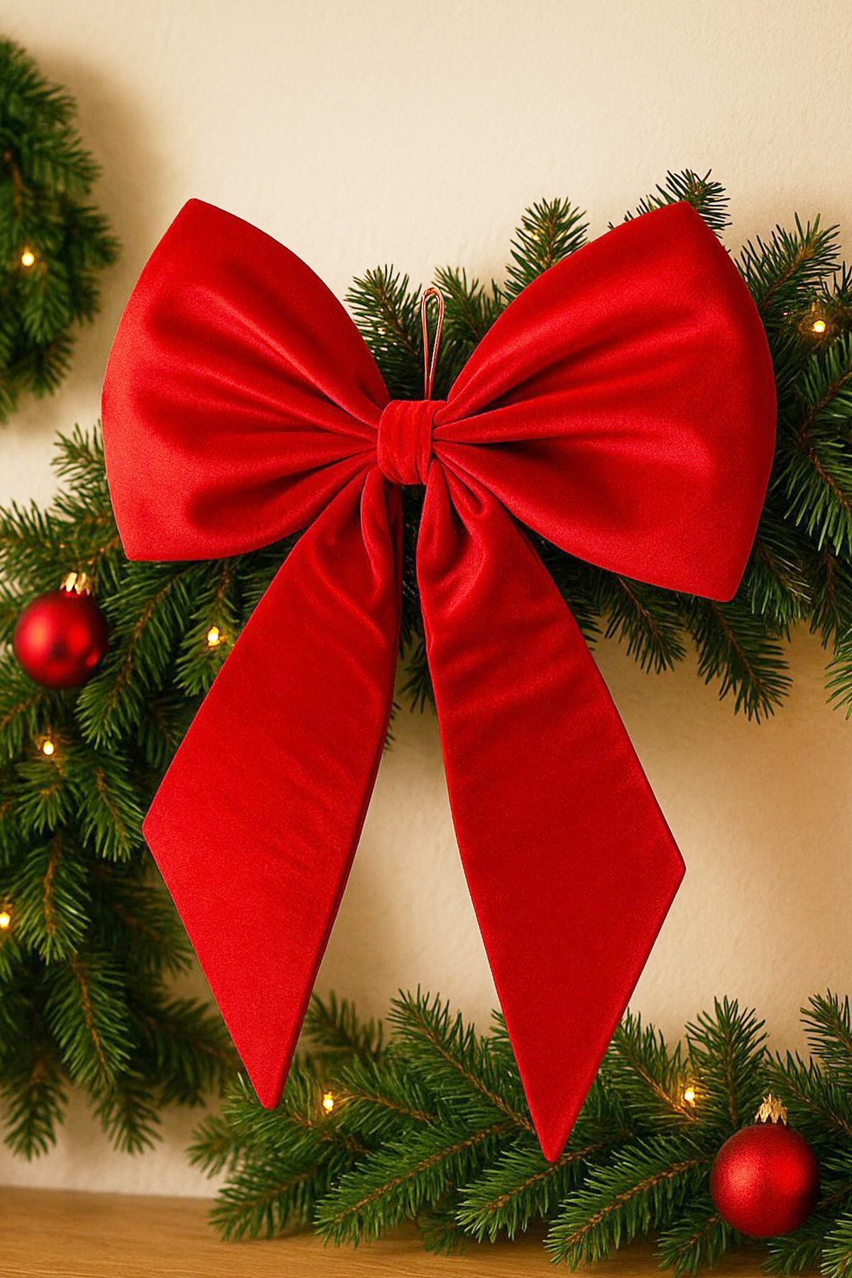 Beysüs Yılbaşı Süsü Lüks Büyük Kırmızı Fiyonk, 70x47 cm ölçüsüyle yeni yıl dekorasyonuna zarafet ve ihtişam katar. Kadife dokusu ve zengin kırmızı tonu sayesinde kapı, vitrin, çam ağacı ya da duvar süslemelerinde dikkat çekici bir görünüm oluşturur. Kaliteli işçiliği ve formunu uzun süre koruyan yapısıyla yılbaşı atmosferini en şık şekilde yaşatmak isteyenler için özel olarak tasarlanmıştır.