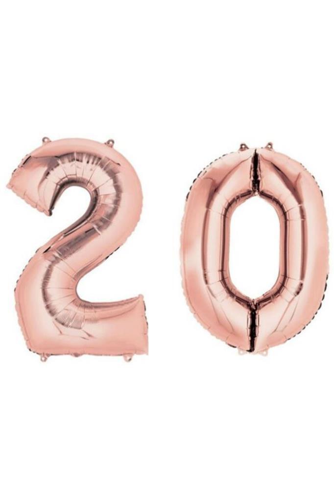 Rakam Folyo Balon 80 cm boyutunda rose gold rengi 2 ve 0 rakamlar.