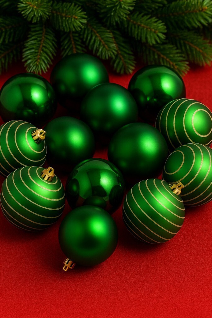 8 cm çapında yeşil cici top yılbaşı süsleri. Parlak yüzeyli ve gold çizgili desenli tasarımlarıyla yılbaşı ağacına şık ve uyumlu bir görünüm kazandırır. Küçük ve orta boy ağaçlar için ideal boyutlardadır. Dayanıklı malzemeden üretilmiş olup uzun süreli kullanım için uygundur. Set içinde 12 adet süs bulunmaktadır. Yılbaşı ağacınızı renklendirmek ve klasik bir şıklık katmak için tercih edebilirsiniz.
