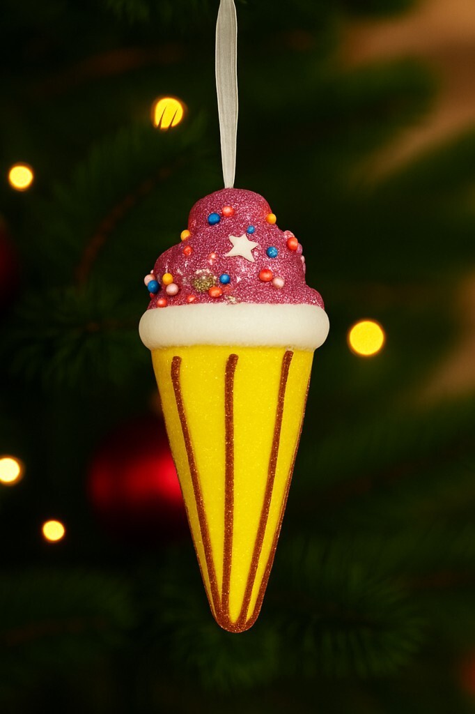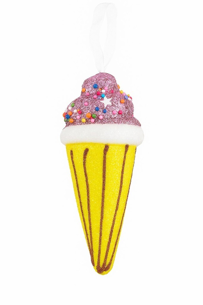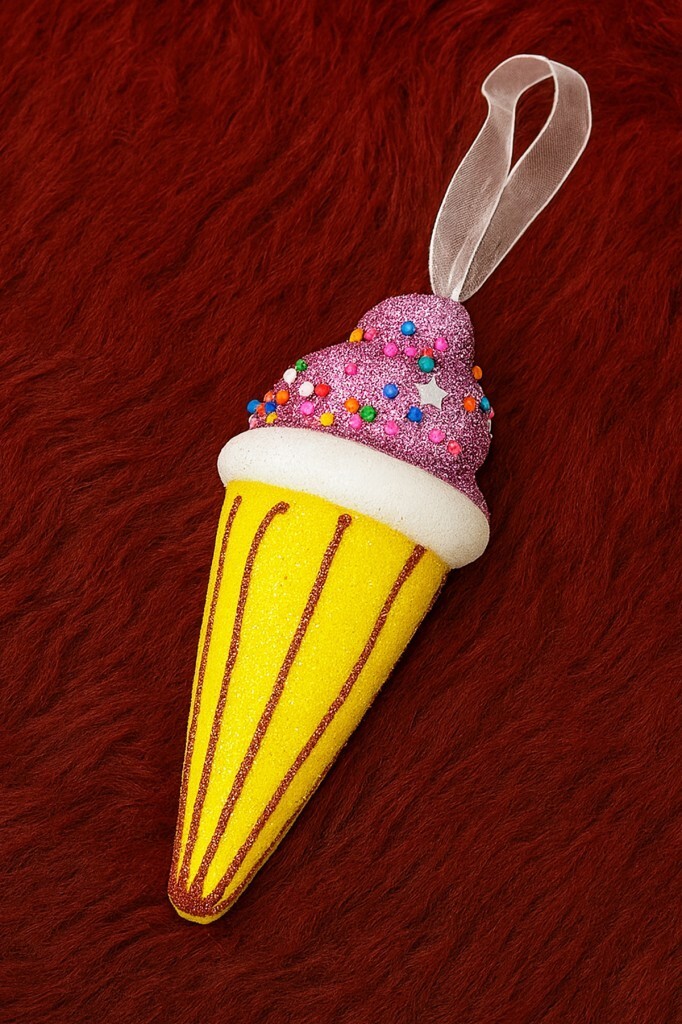 Yaklaşık 15 cm ölçüsündeki bu dondurma tasarımlı süs, yılbaşı ağacınıza renkli ve eğlenceli bir hava katar. Pembe kreması üzerindeki renkli şeker süslemeler ve sarı simli külah tasarımıyla dikkat çeker. Kaliteli malzemeden üretilmiş olup uzun süre kullanılabilir. Şirin ve canlı görünümü sayesinde ağacınızda öne çıkar, yılbaşı dekorasyonunuza tatlı bir enerji katar.