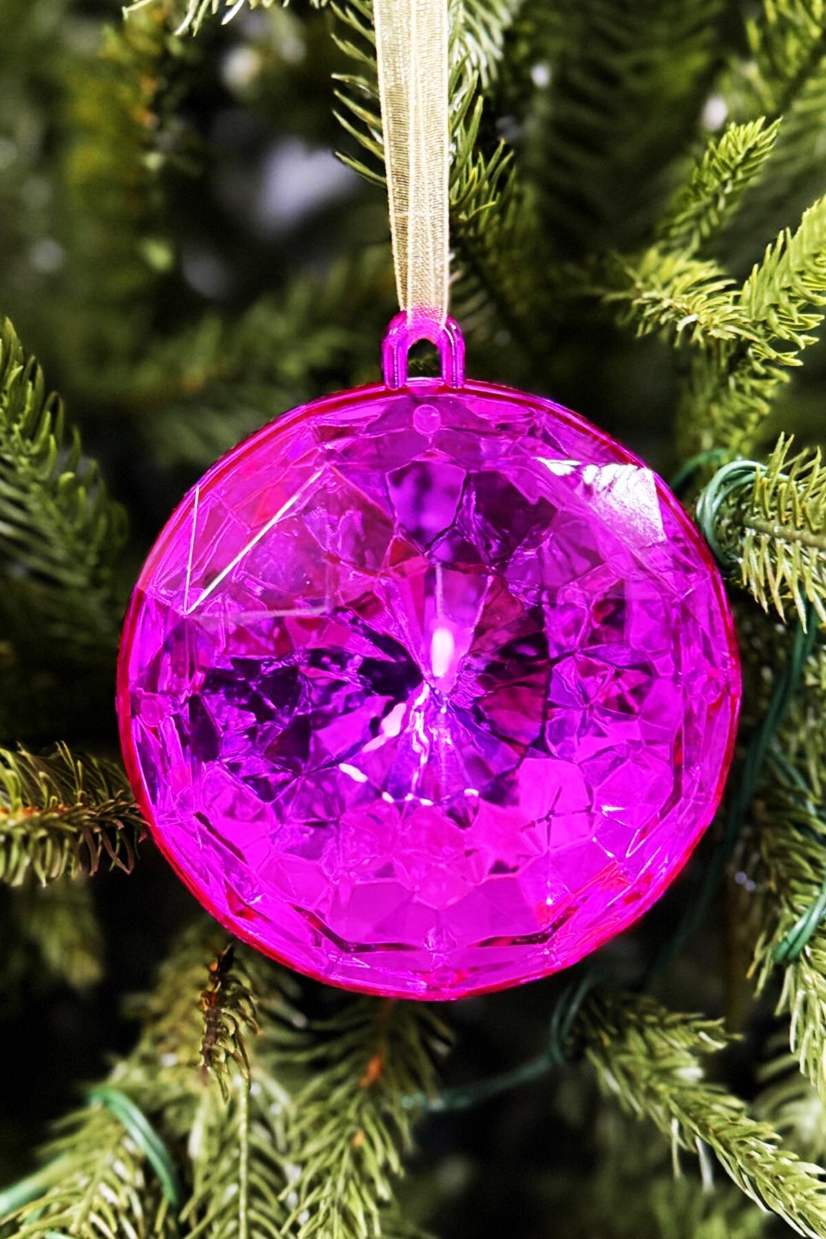 Ürün plastik malzemeden üretilmiş olup kristal yuvarlak kesim görünümü sayesinde yılbaşı ağacına parlak, dikkat çekici ve modern bir hava katar. İç kısmındaki fuşya ton, ışığı kırarak yoğun ve enerjik bir ışıltı oluşturur. Çok yüzeyli yuvarlak formu ışığın her açıdan parlamasını sağlayarak taş benzeri bir etki sunar. Ürünün çapı 10 cm’dir. Hafif yapısı sayesinde çam ağacı dallarına kolayca asılabilir ve renkli, canlı bir yılbaşı dekoru oluşturmak isteyenler için ideal bir seçimdir.