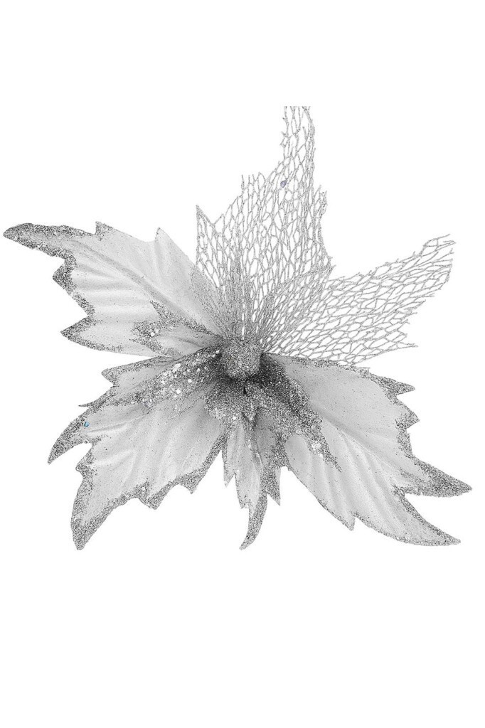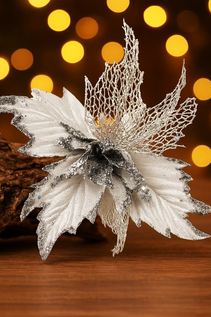 26x26 cm ölçüsündeki gümüş ponsetya yılbaşı çiçeği, zarif ve göz alıcı tasarımıyla süslemelerinize ışıltı katıyor. Simli yaprakları ve ağ tül detayları ışığı yansıtarak parlak bir görünüm oluşturur. Yılbaşı ağacında, kapı süslerinde veya masa aranjmanlarında şık bir tamamlayıcı olarak kullanılabilir. Dayanıklı yapısı sayesinde uzun süre keyifle kullanılabilir.