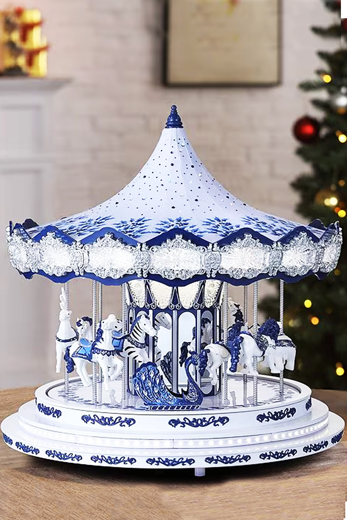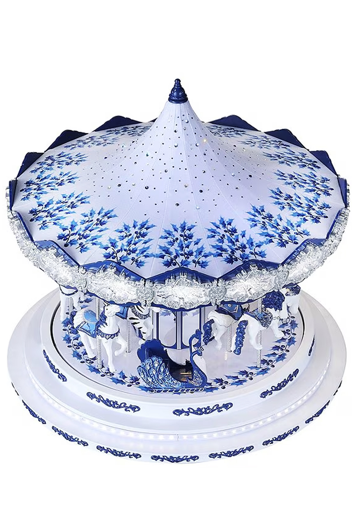 Beysüs Yılbaşı Dekor Lüks Carousel Beyaz Mavi Safir Kadife, dünyaca ünlü Mr. Christmas markasının özel koleksiyon ürünlerinden biridir. Safir tonlarının zarif mavi detaylarla buluştuğu bu model, kadife dokusuyla klasik yılbaşı temasını göz alıcı bir şekilde yansıtır.