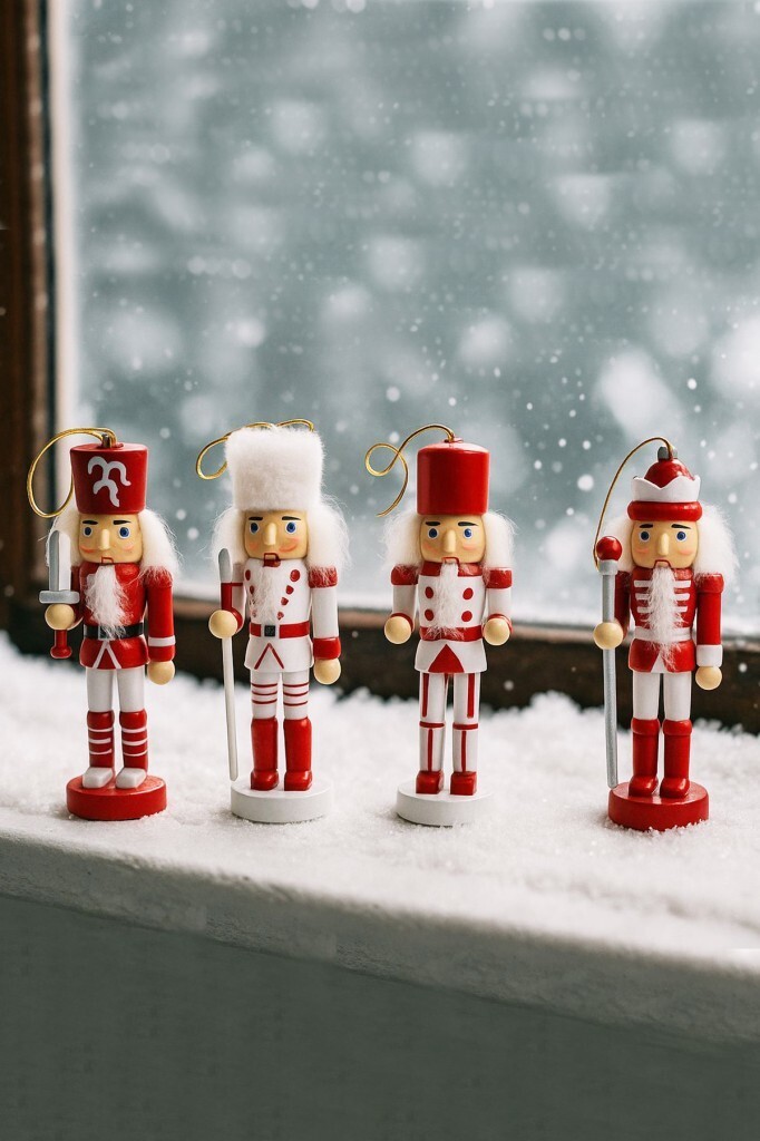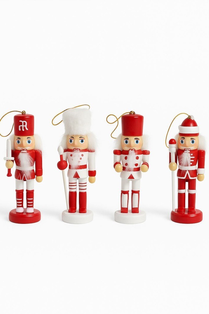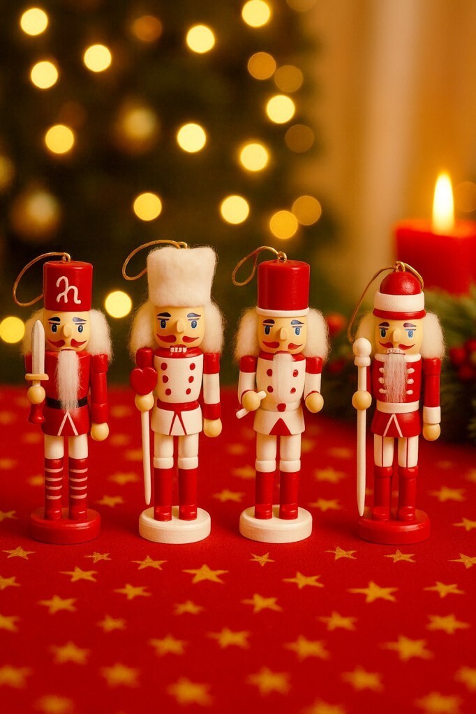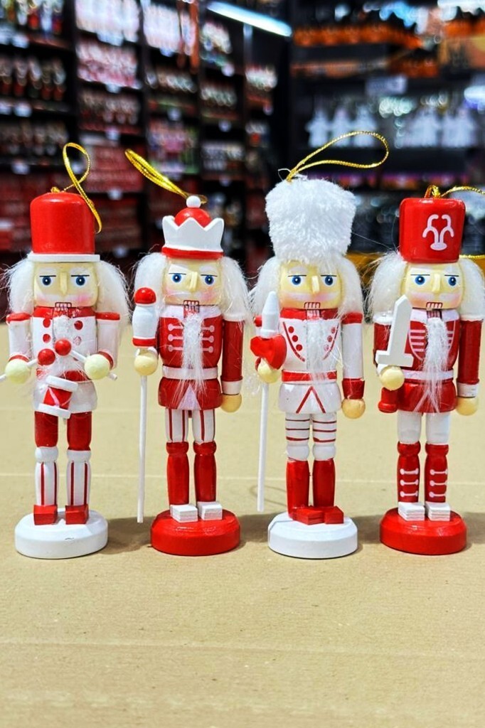 12 cm boyutunda ahşap fındıkkıran süs seti. Kırmızı ve beyaz renklerde tasarlanmış bu fındıkkıran figürleri yılbaşı ağacı süslemelerinde, masa üstü dekorasyonlarında ve vitrinlerde kullanılabilir. Dayanıklı ahşap malzemeden üretilmiştir. 4’lü set olarak satışa sunulmaktadır.