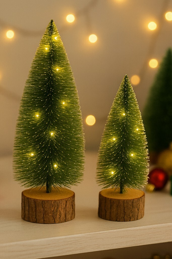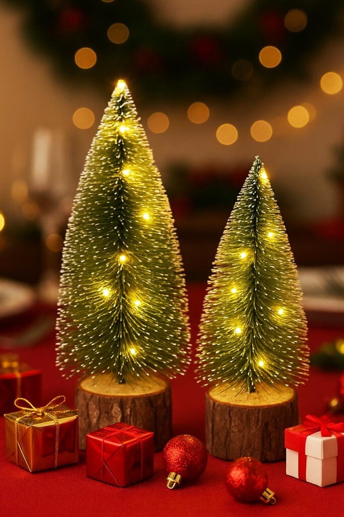 Beysüs ışıklı mini masa çamı seti, yılbaşı dekorasyonunuza şık ve sıcak bir hava katar. 2 farklı boyda tasarlanan (19 cm ve 22 cm) bu mini çamlar, doğal görünümlü ahşap tabanları ve LED ışıklarıyla dikkat çeker. Pilleri kendi içinde dahildir ve tabanın içine gizlenmiştir, bu sayede kablo karmaşası olmadan dekoratif bütünlüğünü korur. Masalarda, pencere kenarlarında veya farklı dekorasyon köşelerinde rahatlıkla kullanılabilir. Işıkları sayesinde karanlık ortamlarda bile göz alıcı bir ışıltı sunarak ortama yılbaşı ruhunu taşır.
