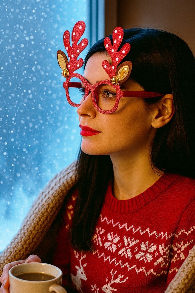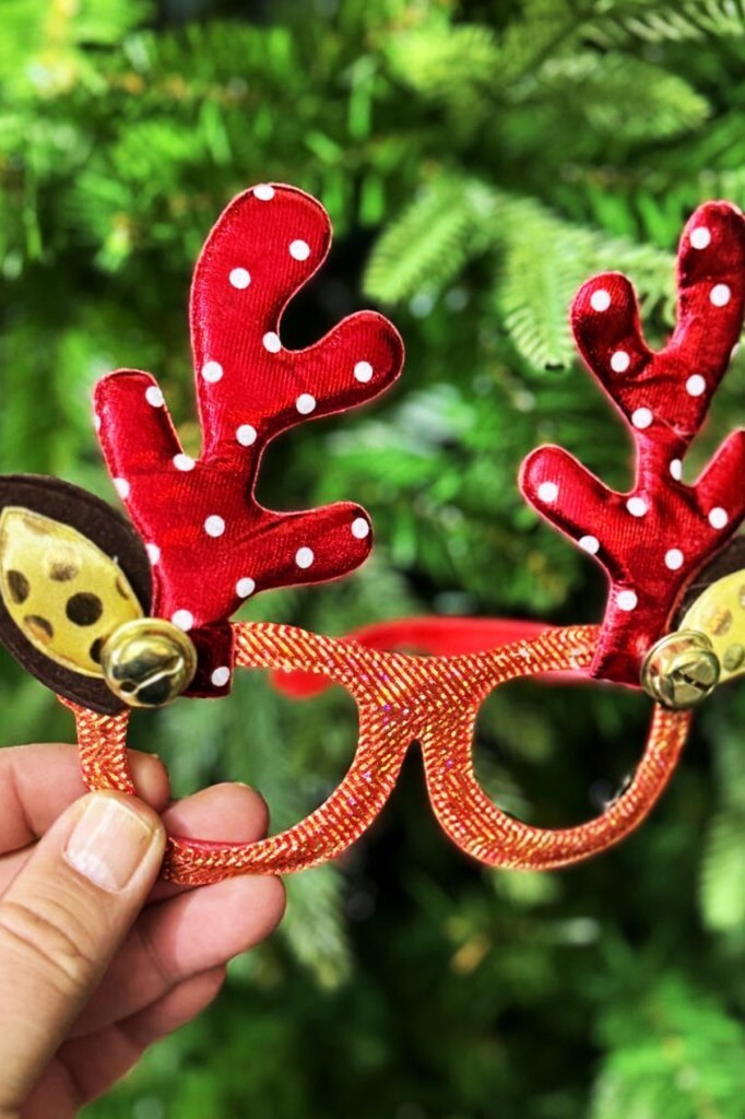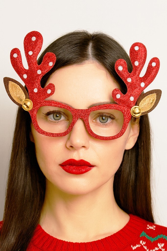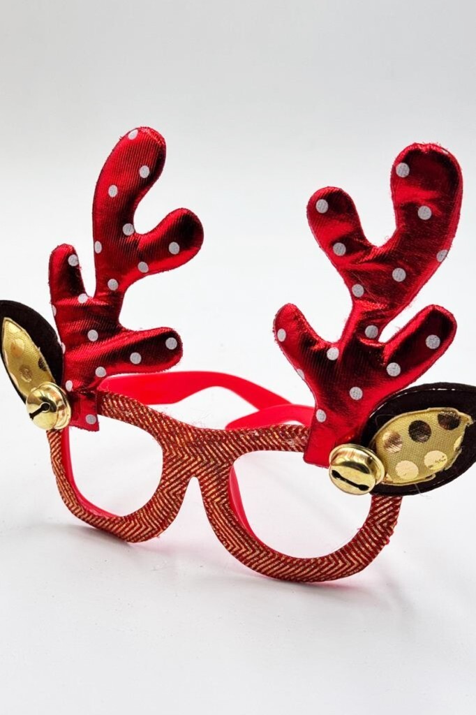 Yılbaşı temalı kırmızı gözlük, eğlenceli ve dikkat çekici tasarımıyla kutlamalara neşe katar. Üzerindeki puantiyeli boynuz süsleri ve yan taraflardaki altın renkli çan detaylarıyla şık bir görünüm sunar.